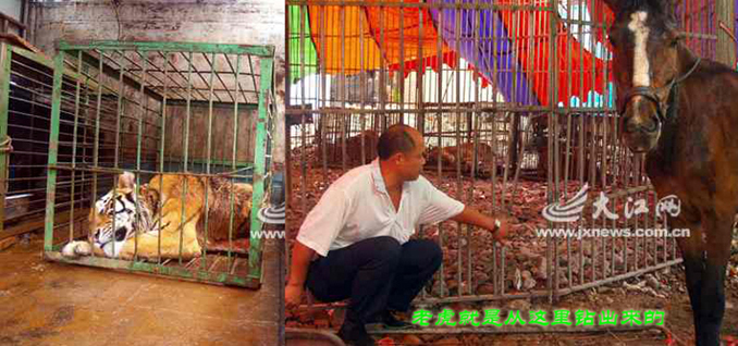 在护栏的另一头,3个大笼子里睡着老虎、狮子等猛兽。一边停放的卡车上,一头大黑熊和一只脖子上绑有绳子的老虎分睡两个大笼里。几名森林公安民警告诉记者,咬人的老虎是脖子上绑有绳子的那一只。